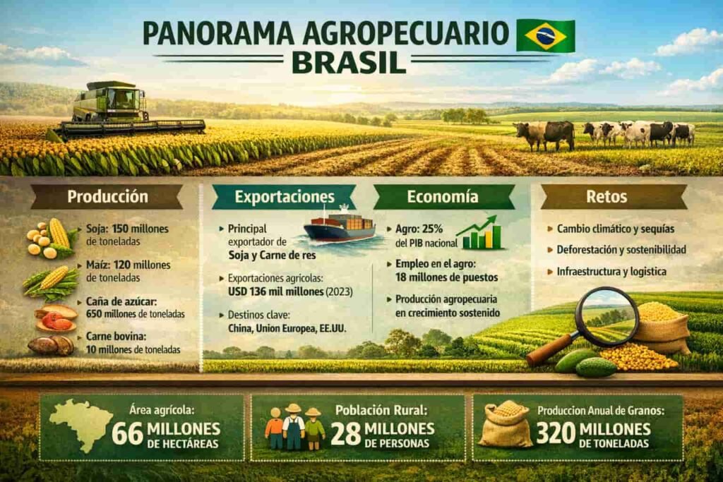 Brasil sigue siendo en 2026 uno de los pilares del sistema agroalimentario mundial. Su capacidad de producir granos, proteínas animales, azúcar, café y biocombustibles lo mantiene como una referencia estratégica para los mercados globales. Sin embargo, detrás de ese liderazgo hay una campaña marcada por contrastes: cosechas sólidas en varias regiones, presión climática localizada, costos de insumos todavía sensibles y un reto logístico permanente para movilizar semejante volumen productivo.