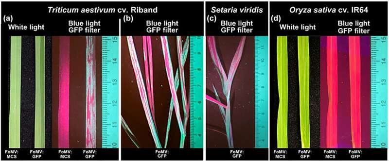 Sobreexpresión de proteínas mediada por virus (VOX) utilizando el vector del virus del mosaico de la cola de zorro (FoMV). Fenotipos de hojas de trigo (a) y arroz (d) inoculadas con FoMV, portador de un sitio de clonación múltiple (MCS) o el gen GFP, bajo luz blanca o luz azul con un filtro GFP. Fotos de la cuarta hoja; a continuación, la hoja inoculada por frotamiento con savia de hojas molidas de Nicotiana benthamiana, agroinfiltradas con FoMV:GFP y el abrasivo carborundo. Fenotipo de plantas de trigo integral (b) y Setaria viridis (c) inoculadas con FoMV:GFP, que muestra infección sistémica. Crédito: