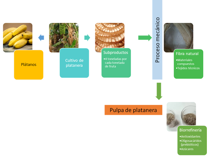 La platanera presenta una composición basada en celulosa, hemicelulosa y lignina y almidón. La extracción de fibras del pseudotallo (principal subproducto de la platanera) supone una alternativa interesante para valorizar el residuo. Sin embargo, este proceso solo aprovecha un pequeño porcentaje del peso total de la planta. Se genera entonces un subproducto, en forma de pulpa, del que pueden obtenerse determinados compuestos de interés.