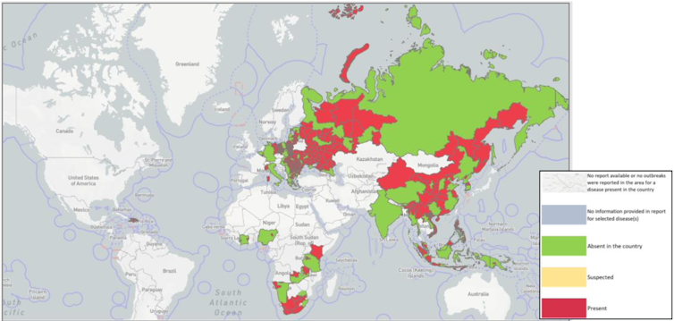 En el año 2018, otros tres países europeos, Hungría, Bulgaria y Bélgica, informaron de la presencia del virus de la peste porcina africana y China alertó de brotes en su territorio. Los brotes en África y Asia y la propagación a Europa no han cesado desde entonces. Al parecer, el virus se expande desde la zona afectada de la Unión Europea moviéndose principalmente en dirección suroeste.