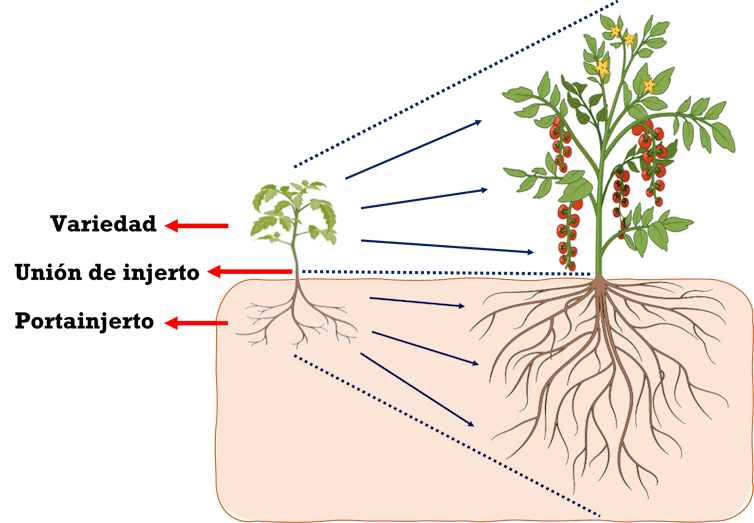 Los injertos se emplean en tomate para aportar resistencia a nematodos, hongos y bacterias (figura 3, izquierda) e incrementar la tolerancia a altas y bajas temperaturas, a la salinidad del suelo y a condiciones de sequía. Además, pueden aumentar el vigor de la planta y su rendimiento.