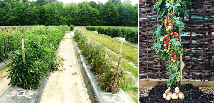 Un curioso caso de tomate injertado es el Tomtato®, una ingeniosa idea en la que se combinan tomate (parte aérea) y patata (parte radical) obteniendo de una misma planta frutos (tomates) y tubérculos (patatas) (figura 3, derecha).