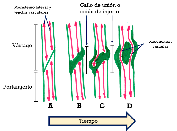 En el proceso participan diversos tejidos del tallo (el cámbium o procámbium, entre otros) que comienzan a producir nuevas células para rellenar el espacio entre la variedad y el portainjerto, promoviendo su adhesión (figura 4, B). Más tarde, esas células de nueva formación proliferan y forman el cuerpo de lo que se llama callo de unión o unión de injerto (figura 4, C).