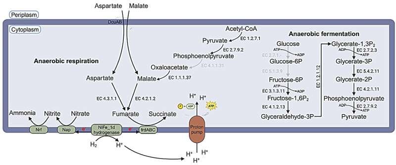 Reconstrucción metabólica de las vías de generación de energía potencial en MGYG000293775 centrada en la reducción de fumarato acoplada a H₂ . Crédito: Microbiome (2025). DOI: 10.1186/s40168-025-02251-2
